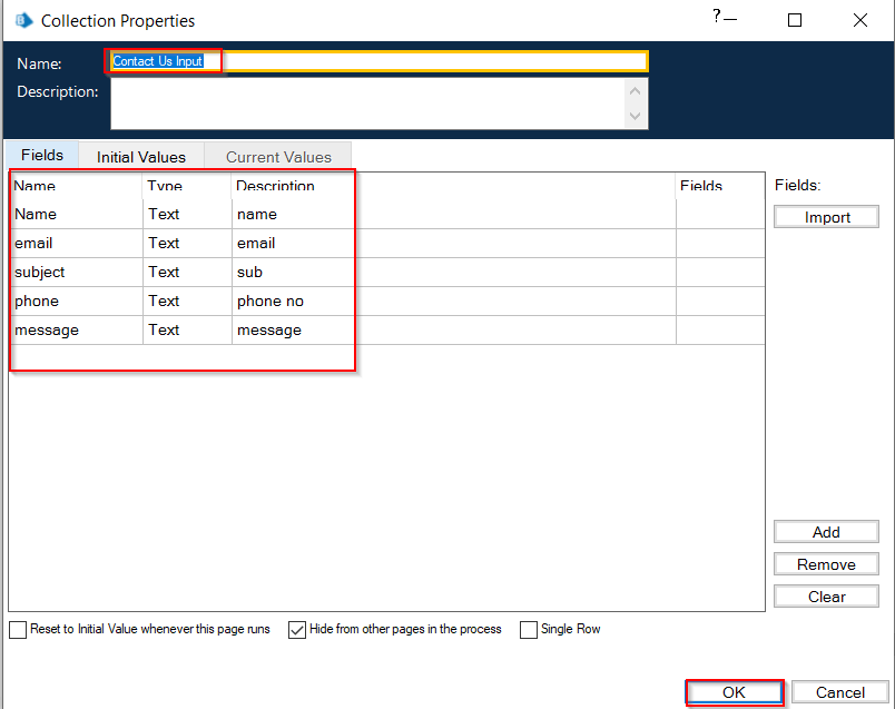 - Action 4 stage, click 'Outputs' tab, below 'Store In' column, drag and drop collection name (Contact Us Input).